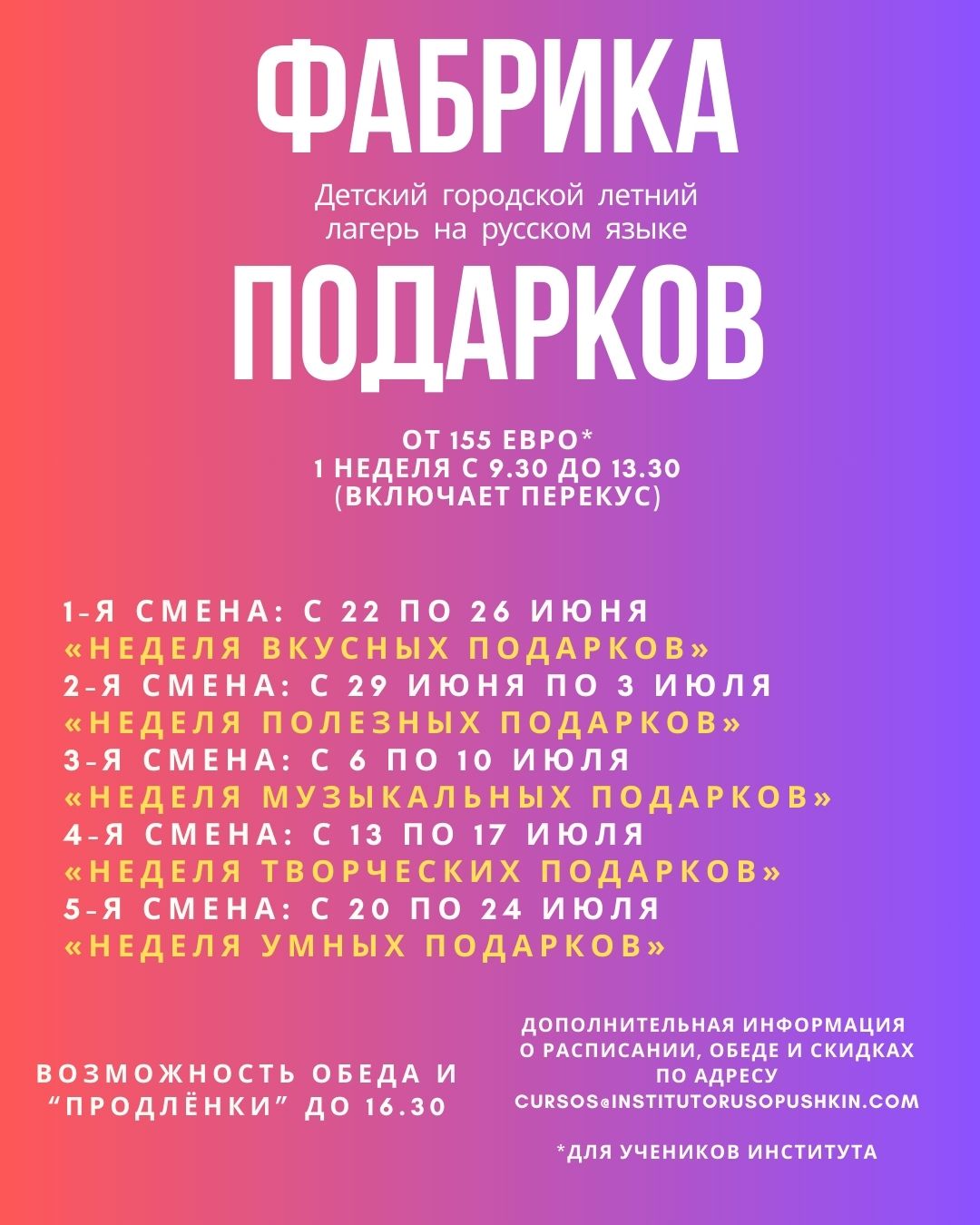 Лагерь работает 5 недель, пять разных смен, с 22 июня по 24 июля 2026.